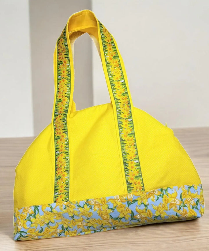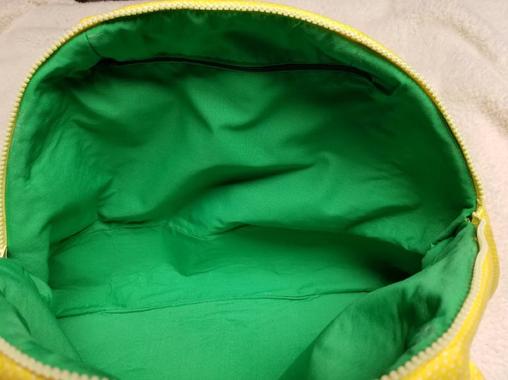 Handmade travel bag crafted from yellow daffodil and dot fabrics with green lining, zip pocket, and sturdy soft-interfaced design—perfect for stylish, functional travel.