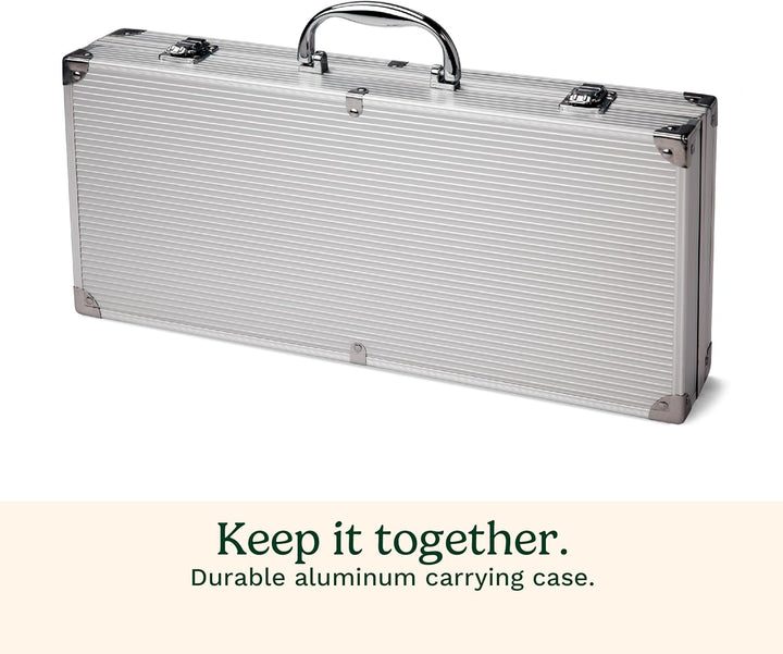 - ALUMINUM CARRYING CASE: Our sturdy, stylish and compact aluminum carrying case perfect for easy transport and organized storage of your grill set.